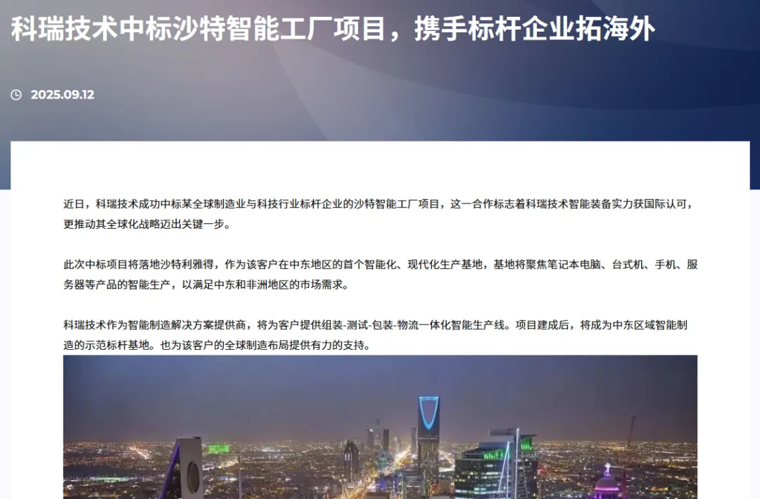 科瑞技术【002957】主要从事工业自动化设备的研发、设计、生产及精密零部件制造业务。2021年携手昆定位明晰战略定位后,在昆仑师资团队的辅导下聚焦核心赛道,优化资源配置强化技术攻坚,技术价值与商业价值实现同步增长。2025上半年公司营业收入为11.06亿元,同比增长6.31%;归母净利润为1.23亿元,同比增长37.28%。9月12日,官方发布消息称,成功中标沙特智能工厂项目,携手标杆企业拓海外。
